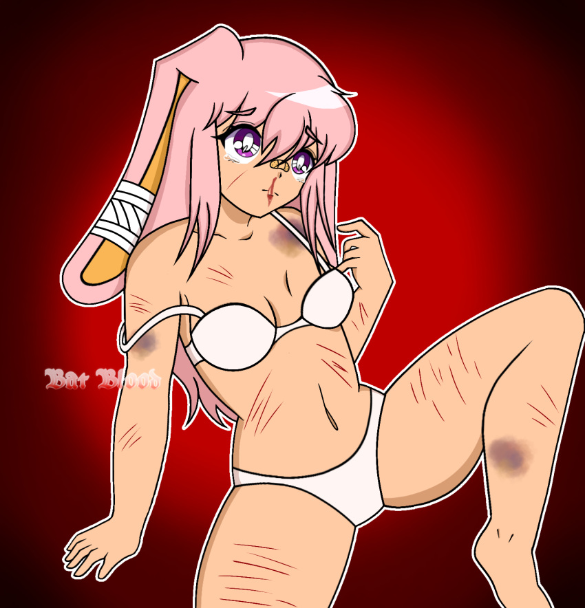 1girl 1girl 2000s anime anime_girl anime_style bandages bat_blood bra bra_strap bra_strap_down bruised bruises bunny_ears bunny_girl digital_drawing_(artwork) digital_media_(artwork) legs_apart legs_spread long_hair nosebleed panties pink_hair pretty_blood purple_eyes rina_pompom_(pretty_blood) scars scars_on_body tear tearing_up