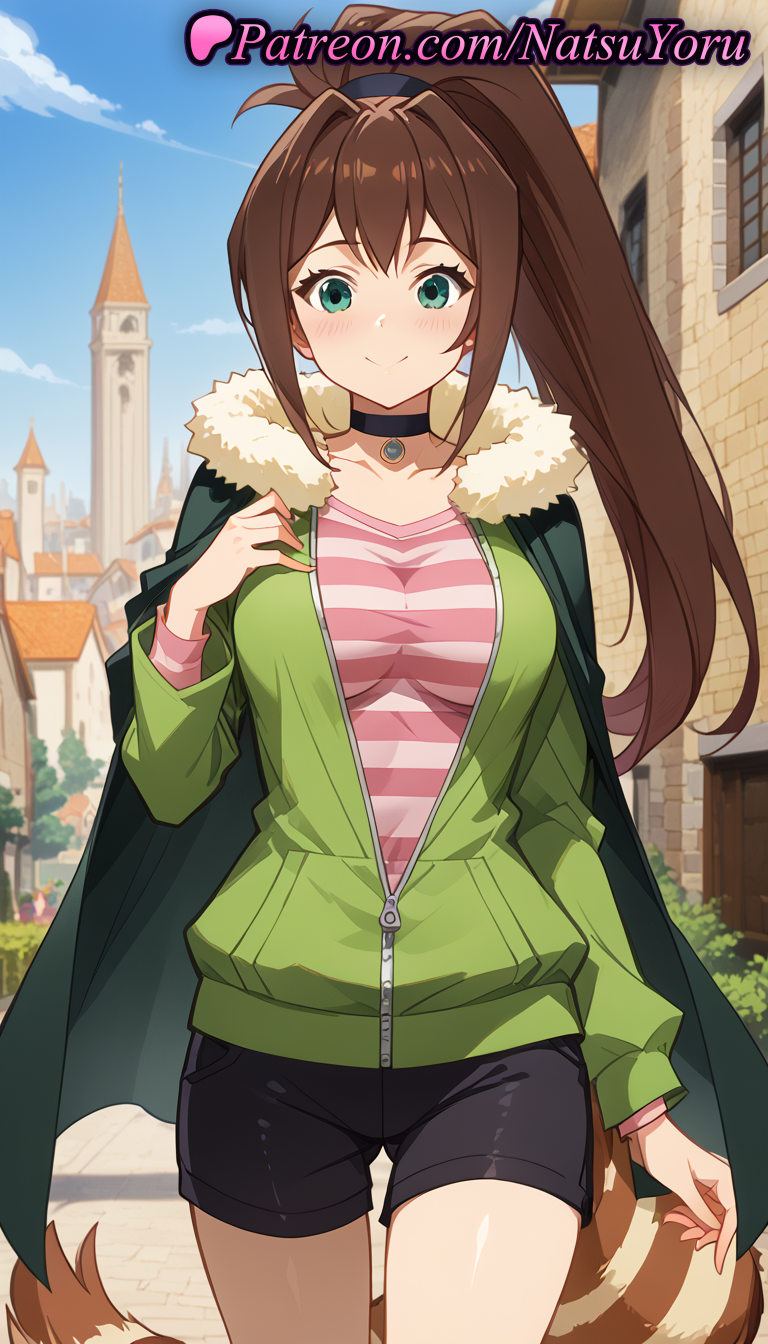 1girl 2025 ai_generated anime anime_style aqua_eyes bangs big_breasts black_choker black_shorts blue_sky blush breasts brown_hair building bust cape choker closed_mouth collarbone cowboy_shot day female_focus female_only female_solo fur-trimmed_cape fur_trim green_cape green_eyes green_jacket hair_intakes hand_on_own_chest hand_up hentai high_ponytail high_quality high_res high_resolution jacket jewelry kono_subarashii_sekai_ni_shukufuku_wo! long_hair long_sleeves looking_at_viewer natsuyoru open_clothes open_jacket outside partially_unzipped patreon pink_shirt ponytail raccoon_tail rin_(konosuba) shirt short_shorts shorts sky smile solo_female stable_diffusion standing striped striped_clothes striped_shirt t-shirt tail thigh_gap voluptuous voluptuous_female zipper zipper_pull_tab