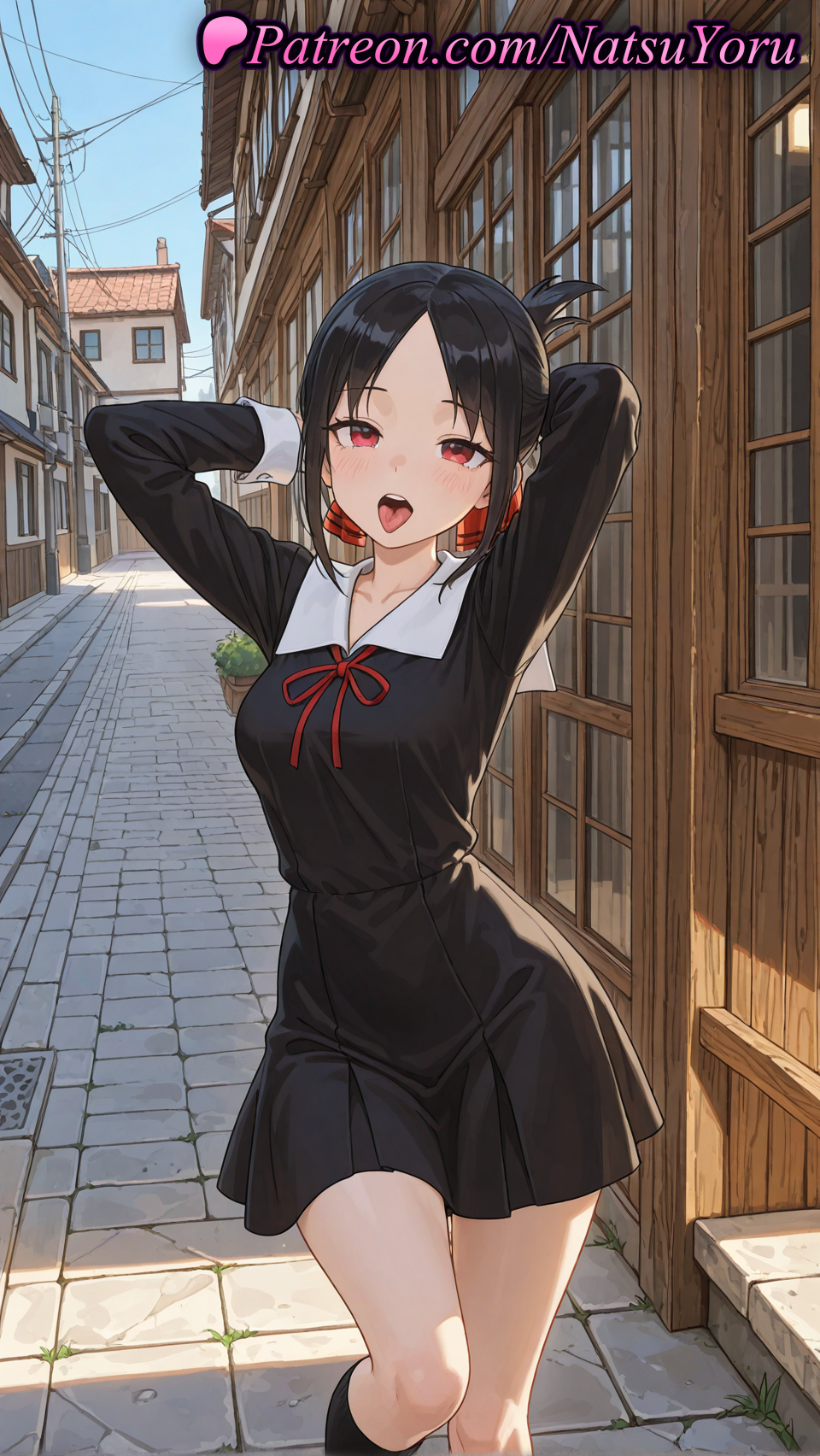1girl 2025 ai_generated anime anime_style arms_behind_head arms_up artist_name bangs big_breasts black_dress black_hair black_socks blush breasts building bust clothing collarbone day dress feet_out_of_frame female_focus female_only female_solo folded_ponytail hair_ribbon hair_ribbons happy_birthday heart heart-shaped_pupils hentai high_quality high_res high_resolution kaguya-sama_wa_kokurasetai_~tensai-tachi_no_renai_zunousen~ kneehighs kneesocks long_sleeves looking_at_viewer medium_breasts natsuyoru neck_ribbon open_mouth outside parted_bangs patreon power_lines red_eyes red_ribbon ribbon road school_uniform shinomiya_kaguya shirt short_hair shuuchiin_academy_school_uniform sidelocks sky smile socks solo_female stable_diffusion standing street thighs tongue tongue_out upper_teeth_only voluptuous voluptuous_female window