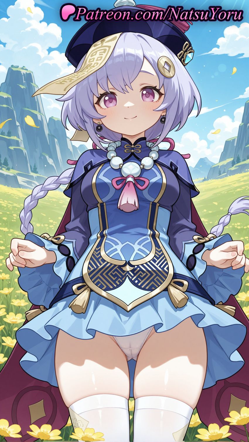 2025 ai_generated anime anime_style asian ass_visible_through_thighs bangs bead_necklace beads big_breasts blue_dress blue_sky blush braid braided_ponytail breasts bust cameltoe cape closed_mouth cloud coin_hair_ornament cowboy_shot day dress earrings female_focus female_solo field flower flower_field flowers frills genshin_impact hair_ornament hat hentai high_quality high_res high_resolution jewelry jiangshi long_hair long_sleeves looking_at_viewer medium_breasts mountain mountainous_horizon natsuyoru necklace ofuda outside panties pantyshot patreon purple_eyes purple_hair purple_headwear qing_guanmao qingdai_guanmao qiqi_(genshin_impact) short_dress single_braid skindentation sky small_breasts smile stable_diffusion standing stockings talisman tassel thighs underwear very_long_hair vision_(genshin_impact) voluptuous voluptuous_female white_panties white_thighhighs wide_sleeves yellow_flower
